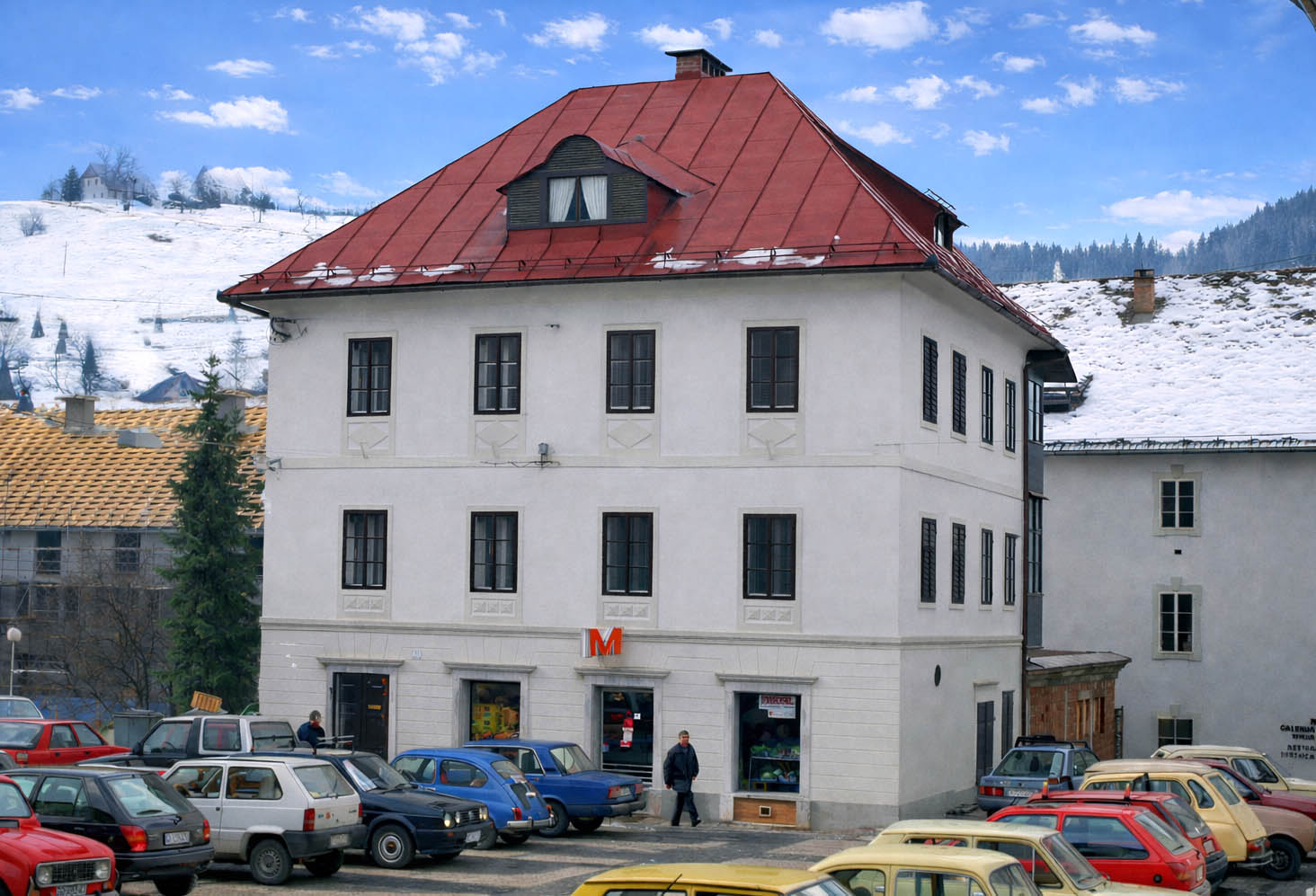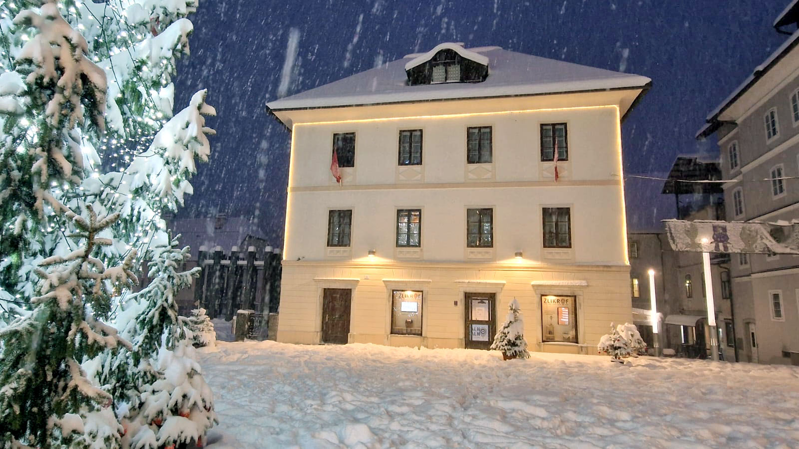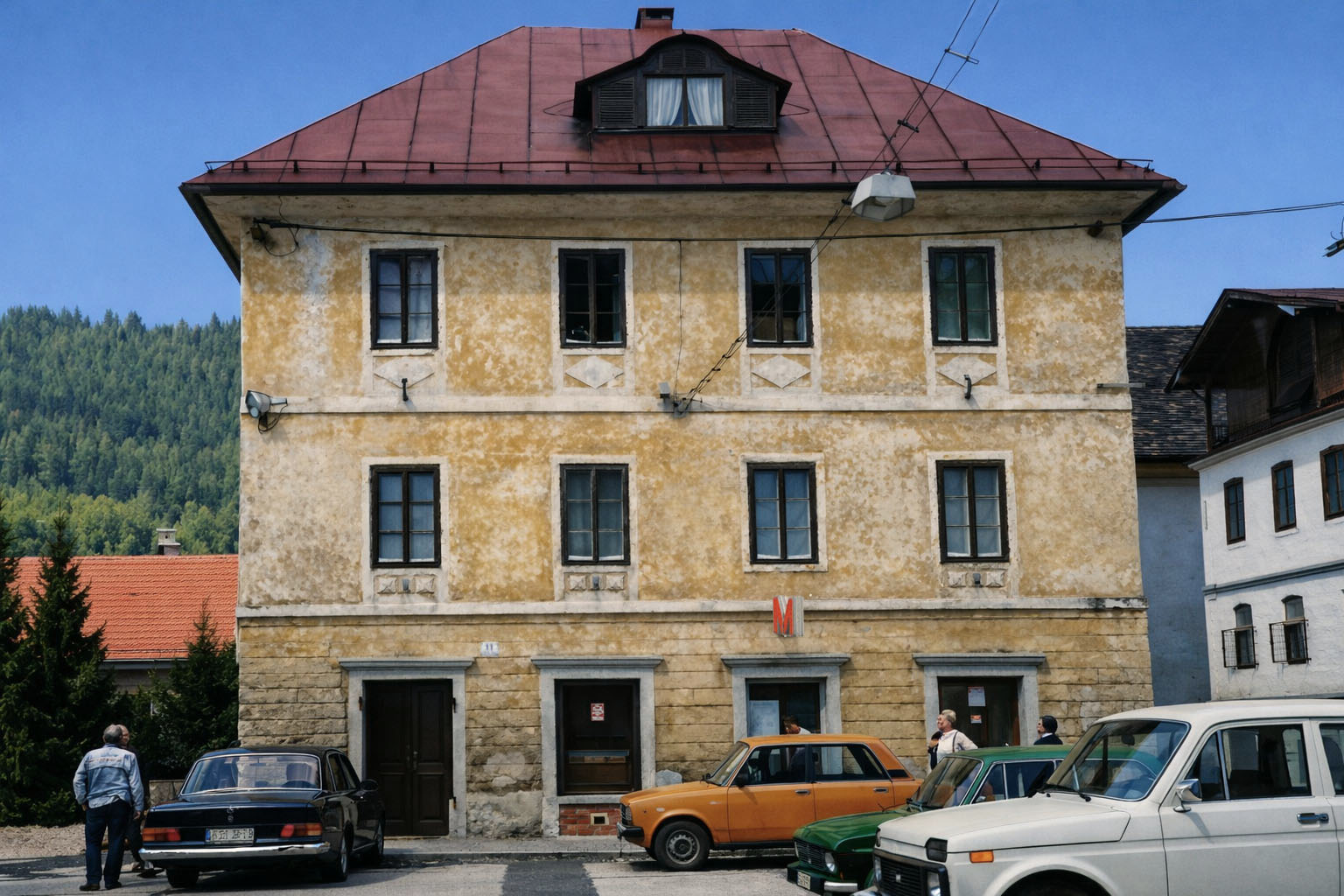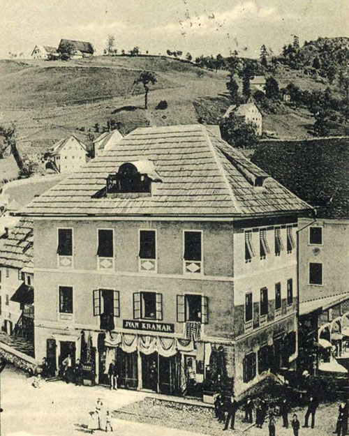 Vsaka hiša nosi zgodbo. Je prostor, kjer se menjajo generacije, kjer se menjujejo poklici, kjer se vsakdanje stvari – kruh, živila, čipka, pogovor – tiho nalagajo ena na drugo. In ko danes stojiš na Mestnem trgu 14, v resnici stojiš pred zgodbo, ki se začne že okoli leta 1800. Takrat je bila hiša drugačna. Z dvokapno streho, ajkrli in prizidki na vzhodu. V virih se kot lastniki omenjajo Ranzingerjevi – Johan (1800), Alojz (1862) in Karolina (1885). Potem pride leto 1880 in hiša zraste. Povišana je za eno nadstropje, razširjena proti vzhodu, pokrita s štirikapno streho, dobi bele vence in okenske okvirje – tako, da se na trgu ujame tudi z bližino cerkve sv. Barbare.